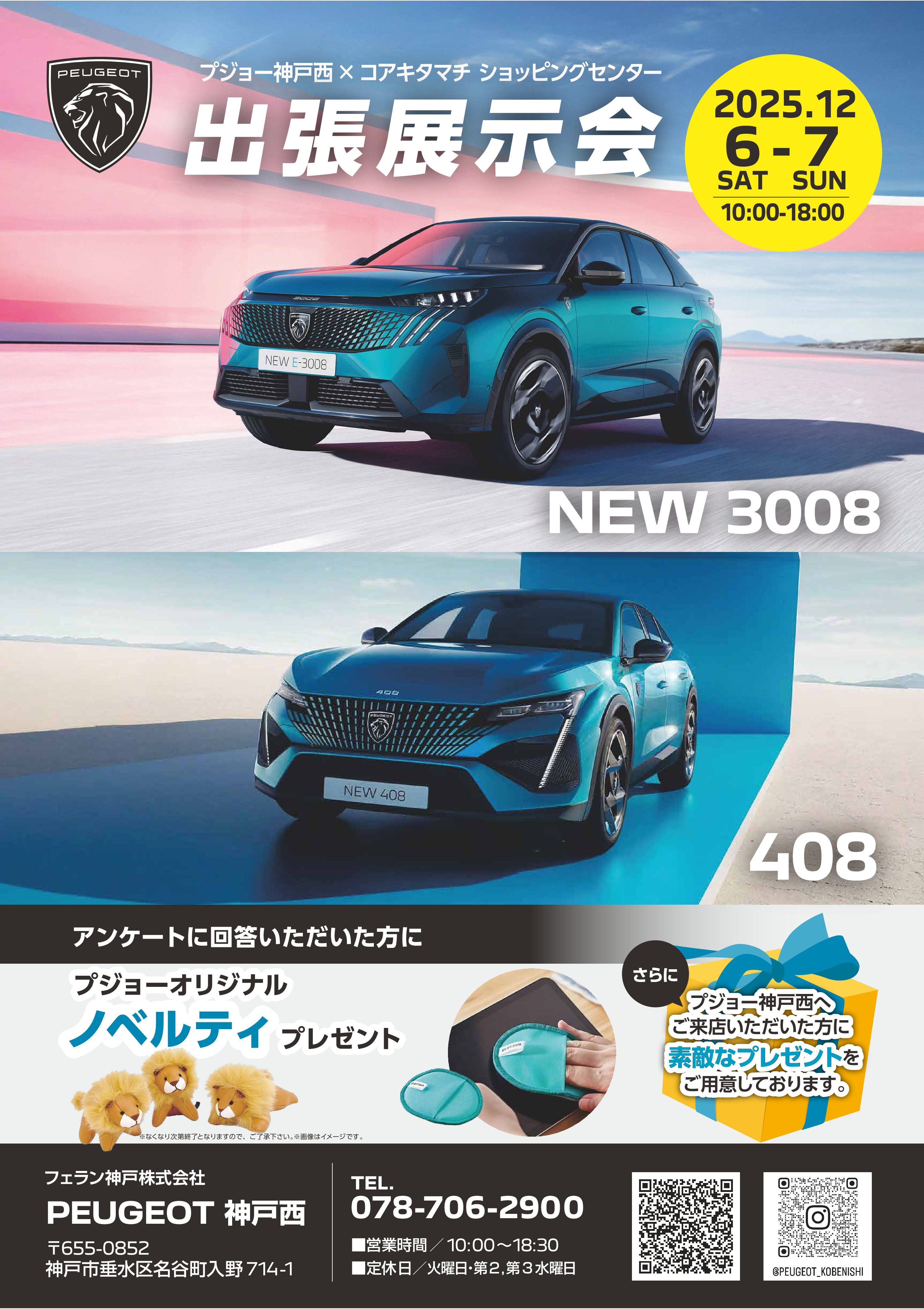 プジョー神戸西×コアキタマチ2511プジョー神戸西パネル 今週末はコアキタマチで移動展示会を開催します アンケートプレゼントもご用意しておりますので皆さまお誘いあわせの上 是非ご来場ください イベント開催日: 2025年12月6日(土)~2025年12月7日(日) 展示車両:208 308 408 new3008 RFTER LONG コアキタマチ・ショッピングセンター